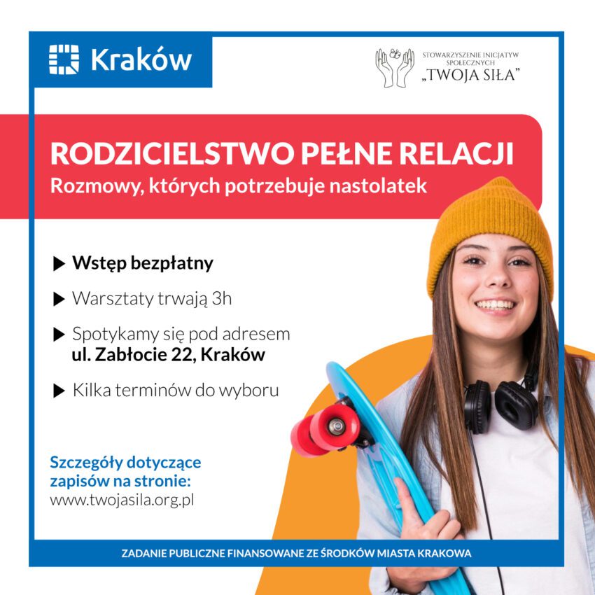 Zapraszamy na warsztaty „Rodzicielstwo pełne relacji. Rozmowy, których potrzebuje nastolatek”. W warsztatach mogą bezpłatnie wziąć udział rodzice dzieci w wieku 11-18 lat. Projekt finansowany jest przez Urząd Miasta Krakowa.